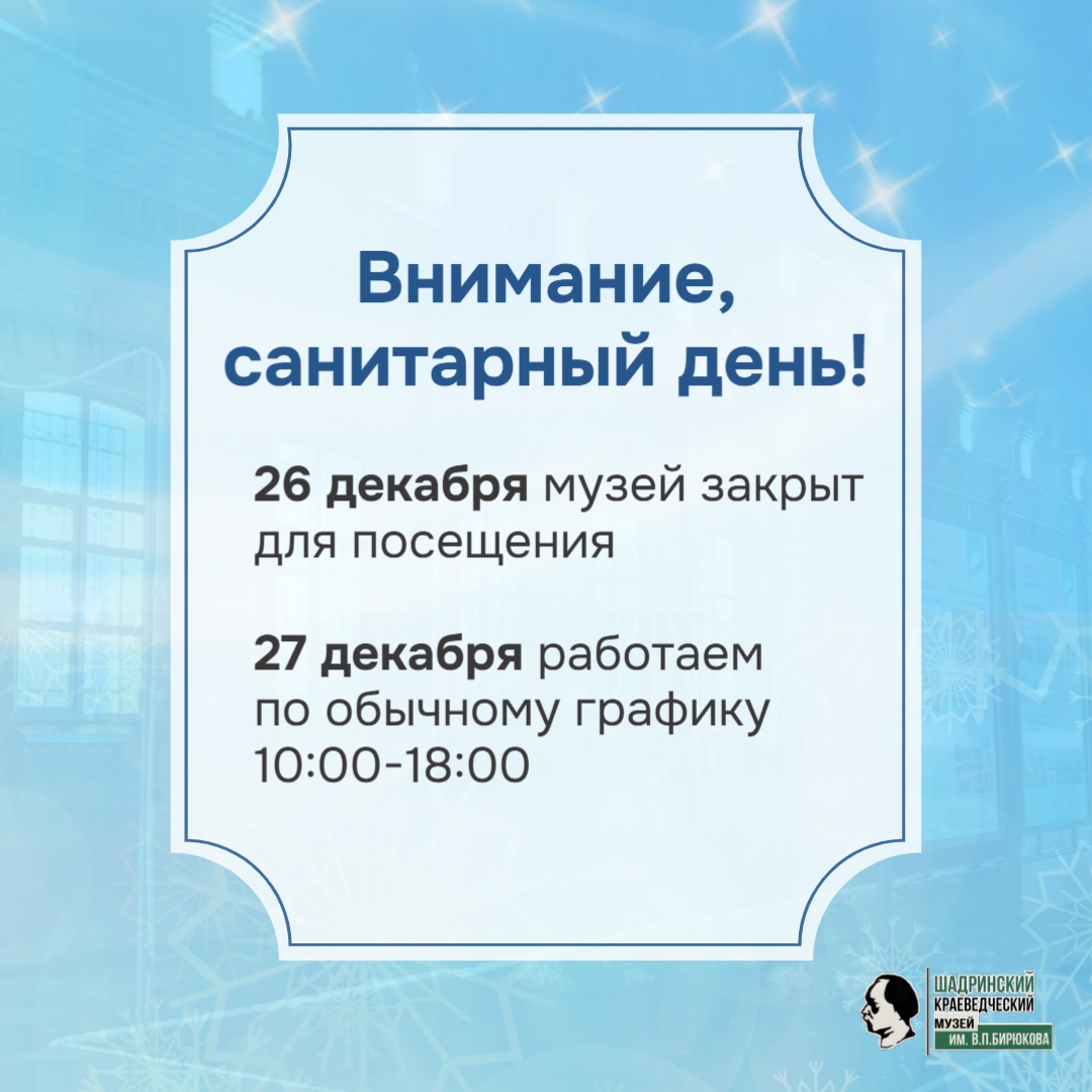 Уважаемые посетители! 26 декабря (пятница) музей закрыт на санитарный день.