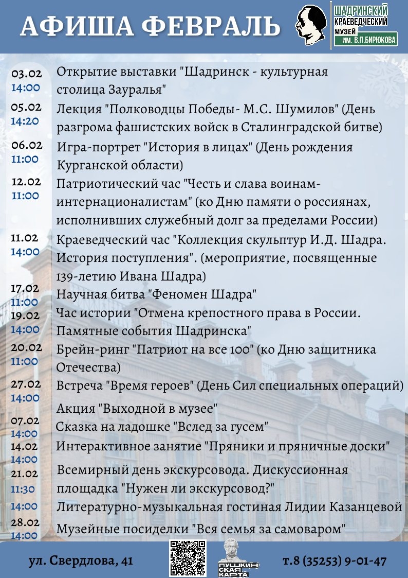 С радостью приглашаем вас на открытие выставки “Шадринск – культурная столица Зауралья!”, посвящённую юбилеям учреждений культуры города, которое состоится 3 февраля в 14:00 в Шадринском краеведческом музее.