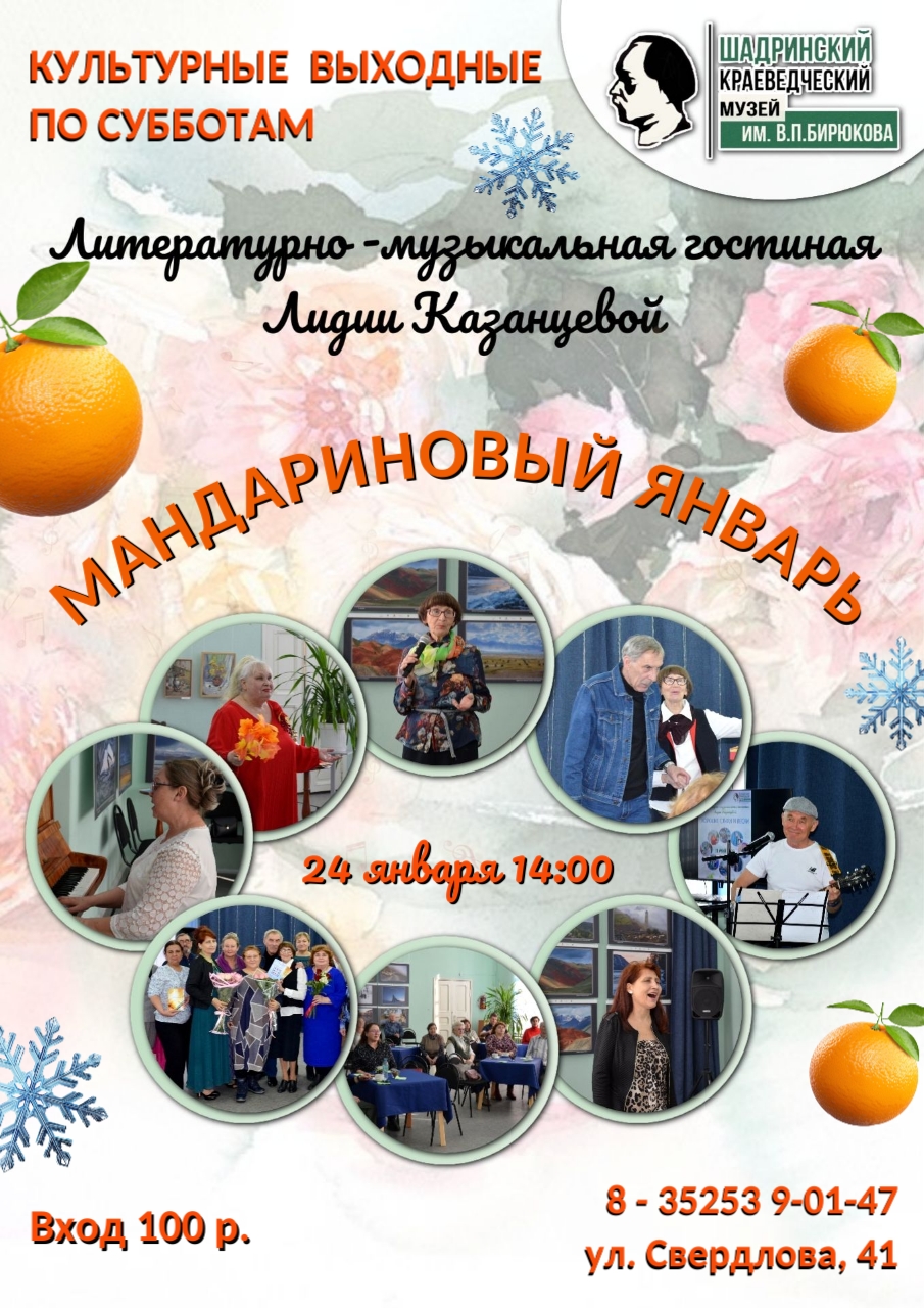 Вы думали праздники закончились? А вот и нет, в музее вас ждёт настоящий праздник для души! Приглашаем вас в музей на литературно‑музыкальную гостиную Лидии Казанцевой «Мандариновый январь» 24 января (суббота) в 14:00.
